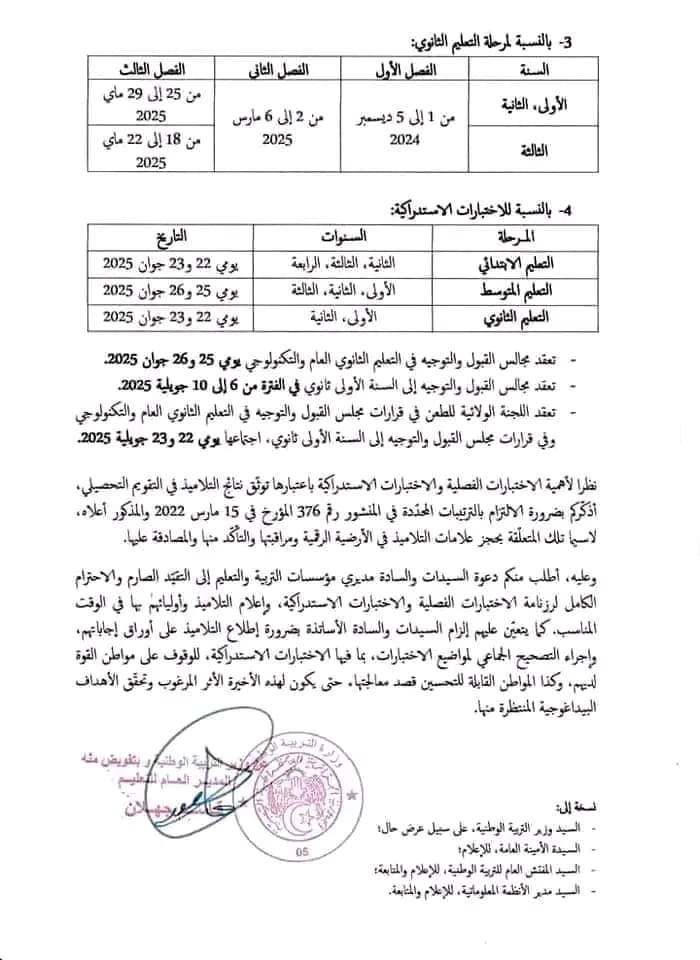 أما اختبارات الفصل الثاني فستكون بين 02 و06 مارس 2025 للمتوسط والثانوي، و بالنسبة للابتدائي بين 04 و13 مارس 2025.