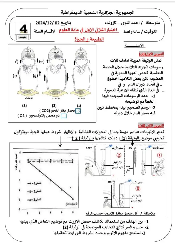 مادة العلوم الطبيعية للسنة 4 متوسط دروس مفصلة، فروض واختبارات، تمارين محلولة: نموذج اختبار في الفصل الأول رقم 3- في مادة العلوم الطبيعية مستوى السنة الرابعة متوسط الجيل الثاني