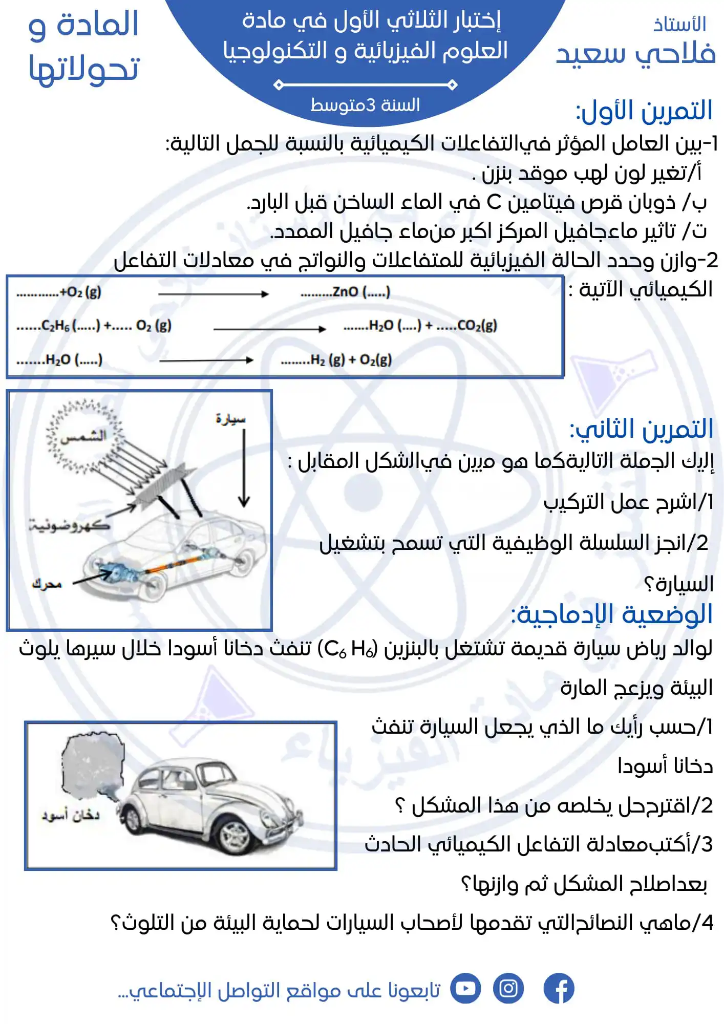 مادة العلوم الفيزيائية والتكنولوجيا للسنة الثالثة 3 متوسط فروض واختبارات، تمارين محلولة: نموذج اختبار في الفصل الأول رقم 2 – في العلوم الفيزيائية والتكنولوجيا مستوى السنة الثالثة متوسط
