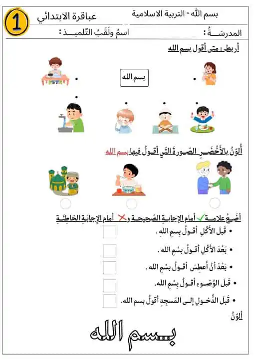 ورقة عمل لدرس “بسم الله “هنا يعرف التلميذ متى يقول بسم الله : قبل الأكل والشرب ،قبل الوضوء،قبل دخول المسجد وقبل القيام بأي عمل نقول بسم الله