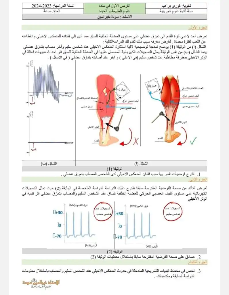 نموذج لإمتحان في الفصل الأول رقم 1 في مادة العلوم الطبيعية مستوى السنة الثانية ثانوي شعبة علوم تجريبية