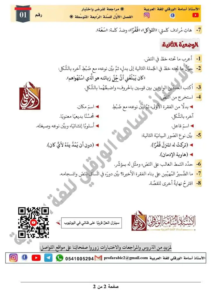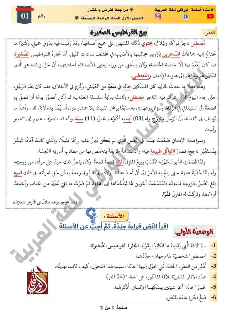 مادة اللغة العربية للسنة الرابعة 4 متوسط دروس مفصلة، فروض واختبارات، تمارين محلولة: نموذج لإمتحان في الفصل الأول رقم 4- في مادة اللغة العربية مستوى السنة الرابعة متوسط الجيل الثاني مع التصحيح