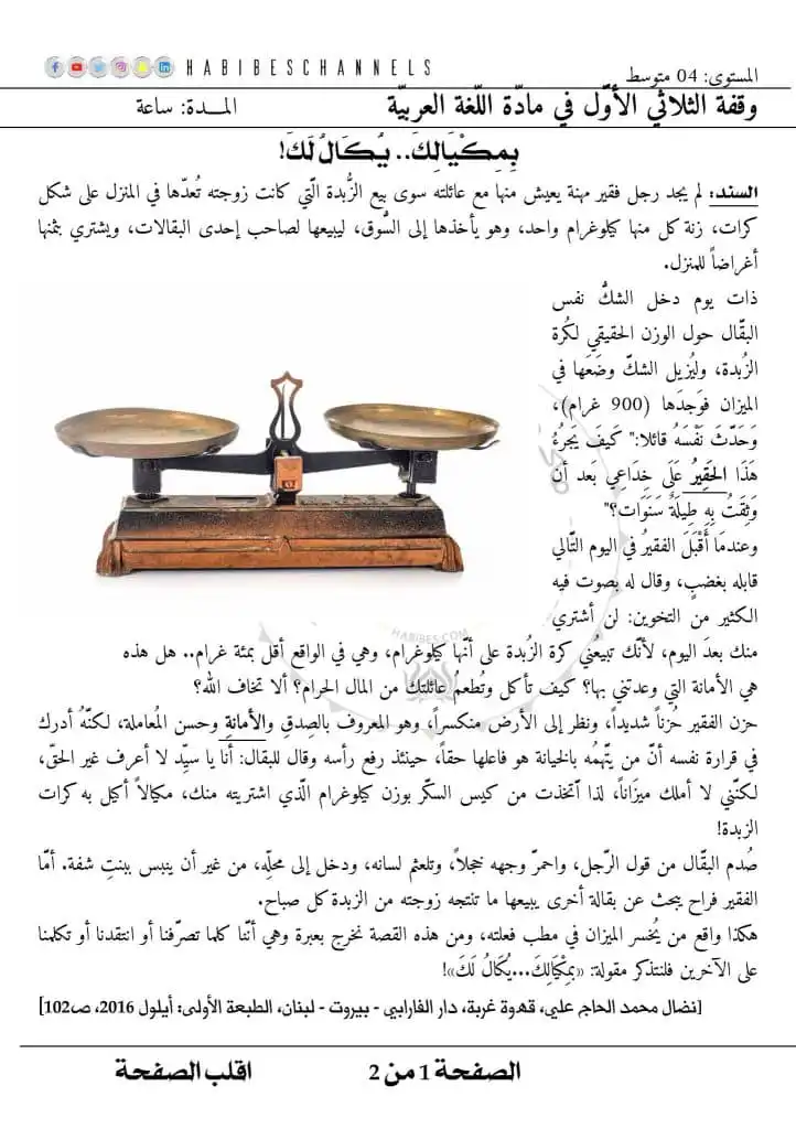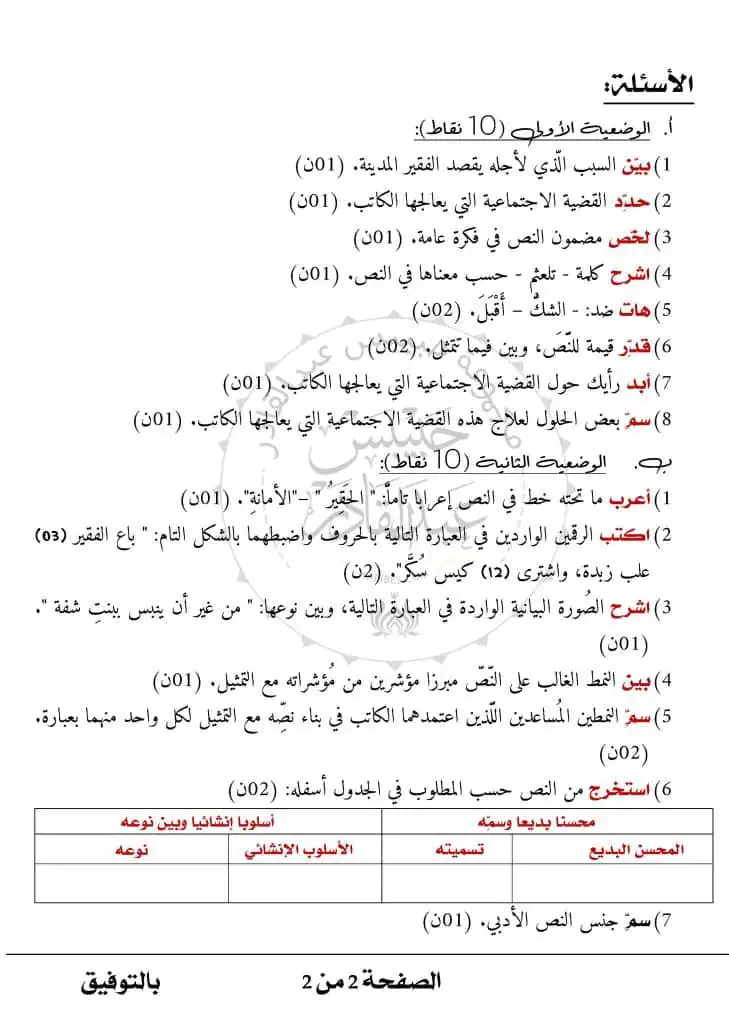 مادة اللغة العربية للسنة الرابعة 4 متوسط دروس مفصلة، فروض واختبارات، تمارين محلولة: نموذج لإمتحان في الفصل الأول رقم 5 – في مادة اللغة العربية مستوى السنة الرابعة متوسط الجيل الثاني مع التصحيح