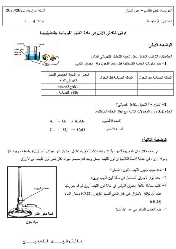 مادة العلوم الفيزيائية للسنة الثالثة 3 متوسط فروض واختبارات، تمارين محلولة: نموذج فرض في الفصل الأول رقم 3- في العلوم الفيزيائية مستوى السنة الثالثة متوسط