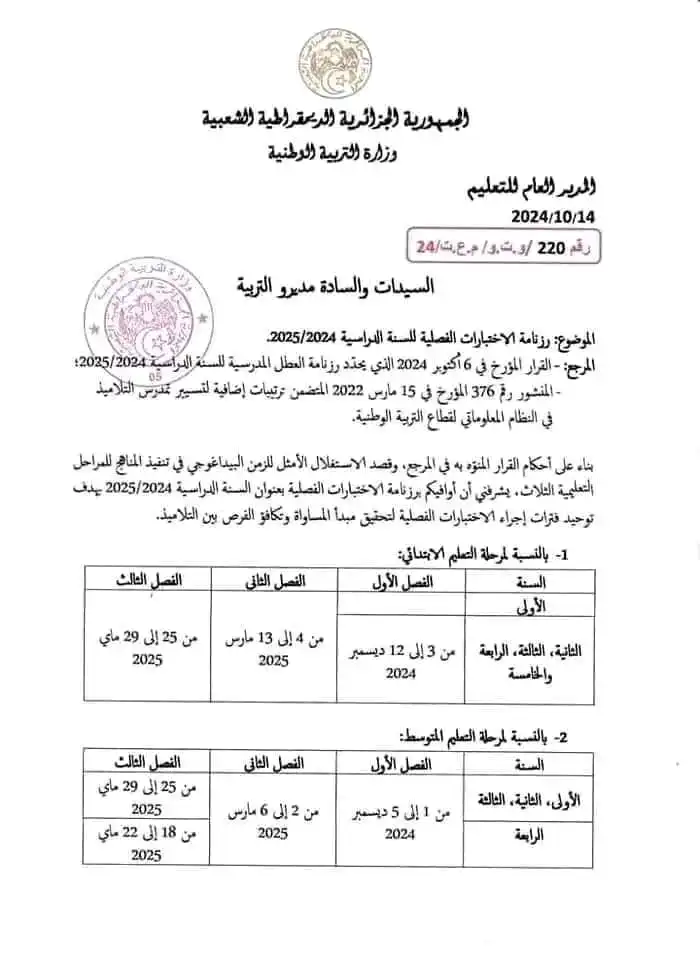 أما اختبارات الفصل الثاني فستكون بين  02 و06 مارس 2025 للمتوسط والثانوي، و بالنسبة للابتدائي بين 04 و13 مارس 2025.