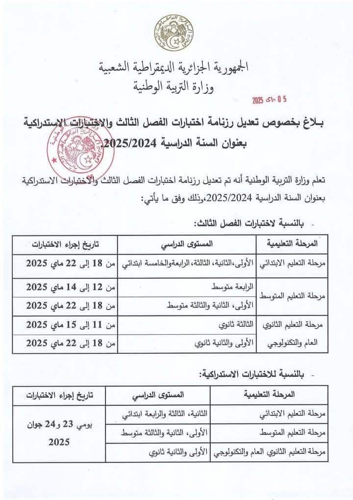 فيما تم برمجة اختبارات الفصل الثالث والأخير في الفترة بين 25 و 29 ماي 2024 لكل سنوات الابتدائي،  وأيضا سنوات الأولى و الثانية و الثالثة متوسط ،وسنوات الأولى والثانية ثانوي.